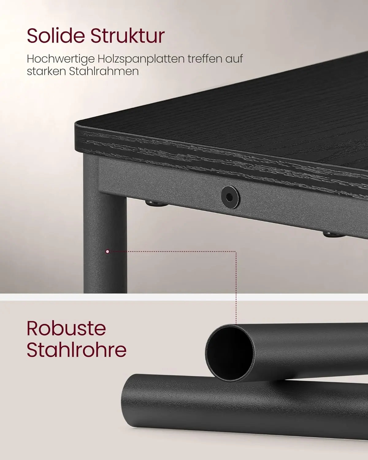 Robust und zuverlässig, hält der Tisch dank seines stabilen Stahlrahmens und der hochwertigen Holzspanplatten bis zu 100 kg aus. So haben Sie einen sicheren Platz für all Ihre täglichen Utensilien.