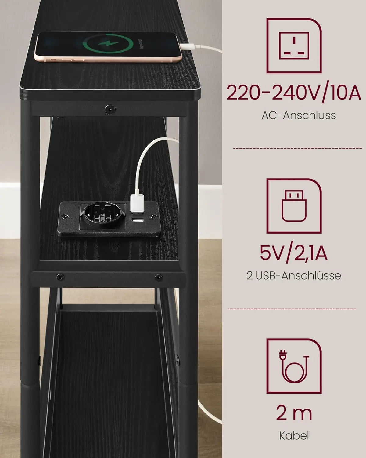 Beistelltisch mit Ladefunktion, 3 Ablagen, schwarz