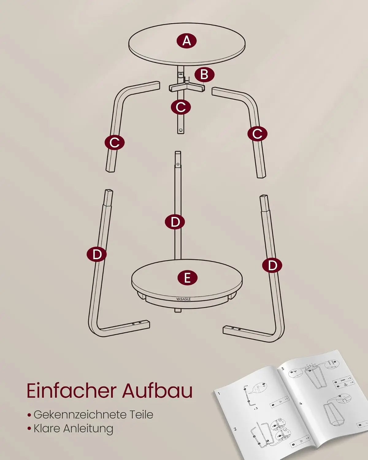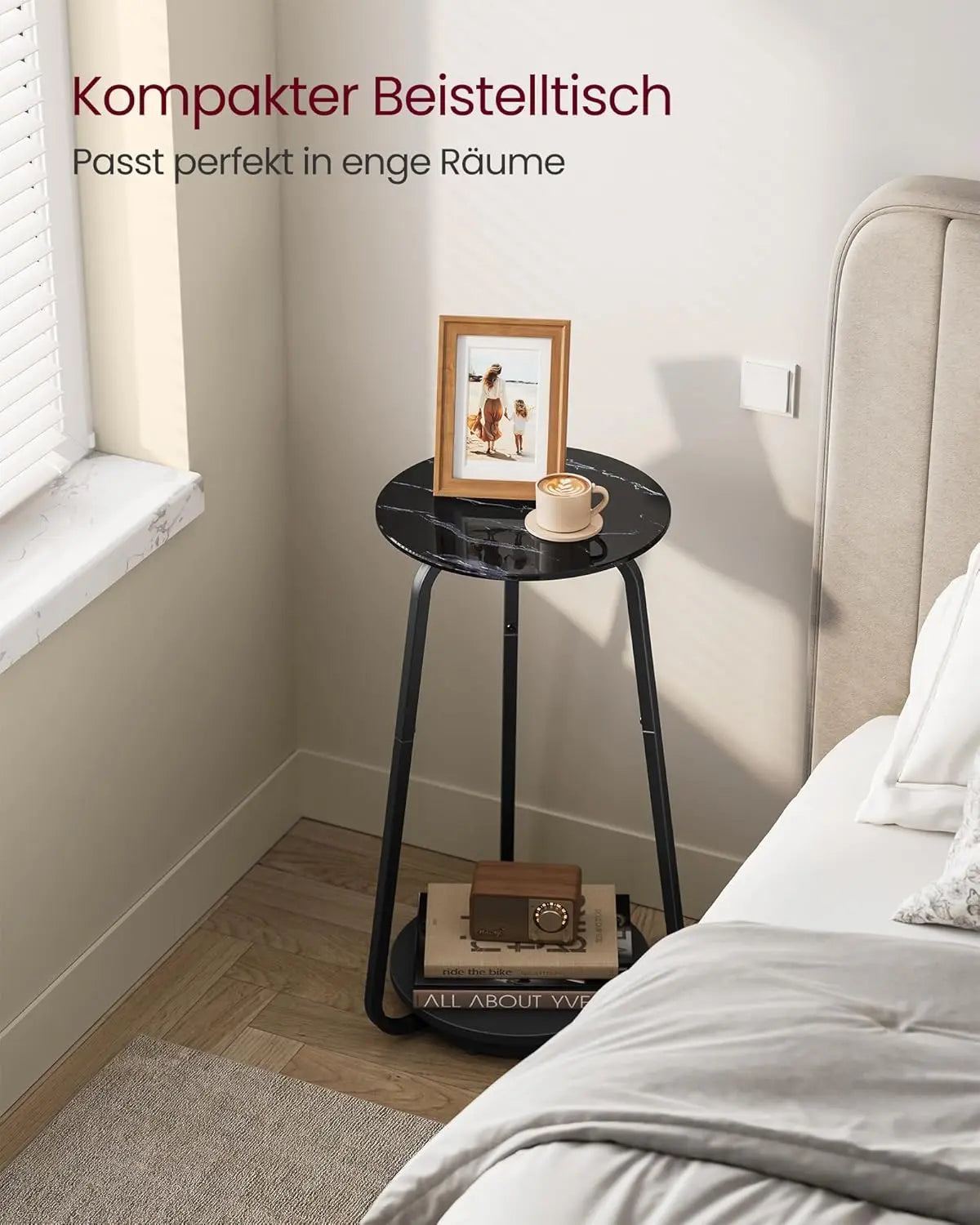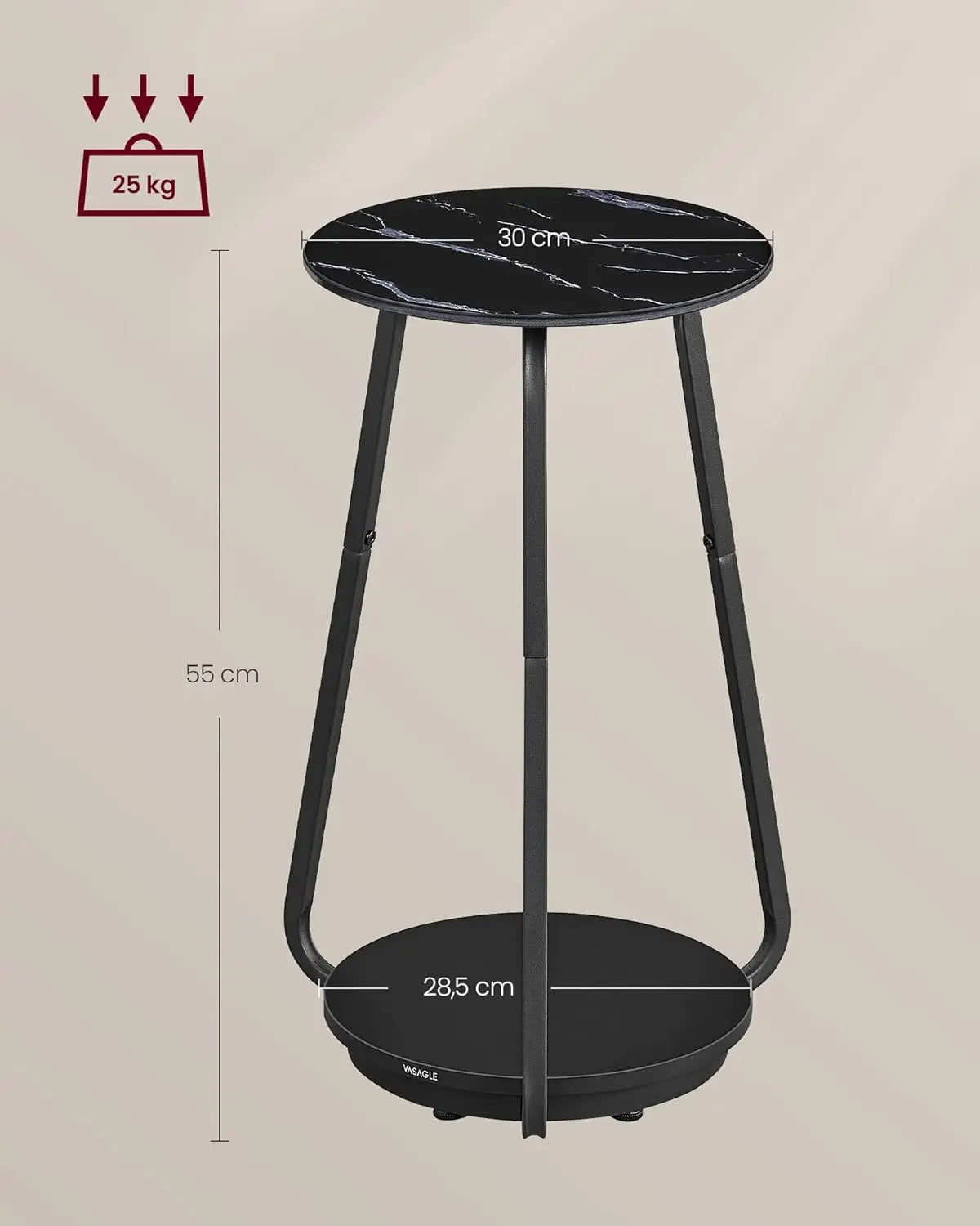 Mit einer maximalen Belastbarkeit von 25 kg ist dieser Tisch robust und zuverlässig. Die zwei offenen Ablagen bieten Ihnen ausreichend Platz, um Ihre wichtigsten Utensilien wie Wasserglas, Fernbedienung, Telefon oder Zeitschriften stets griffbereit zu haben. Mit einem Durchmesser von 30 cm und einer Höhe von 55 cm passt er ideal in kleine Räume und fügt sich harmonisch in jedes Ambiente ein.