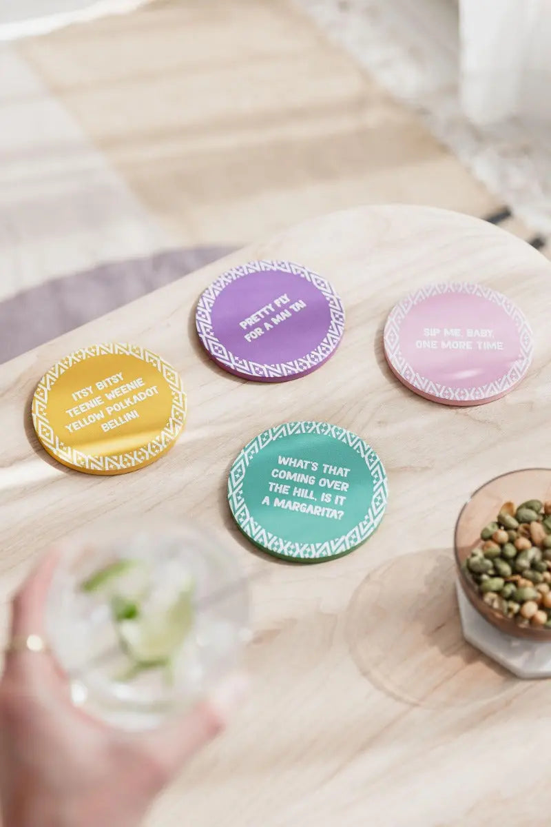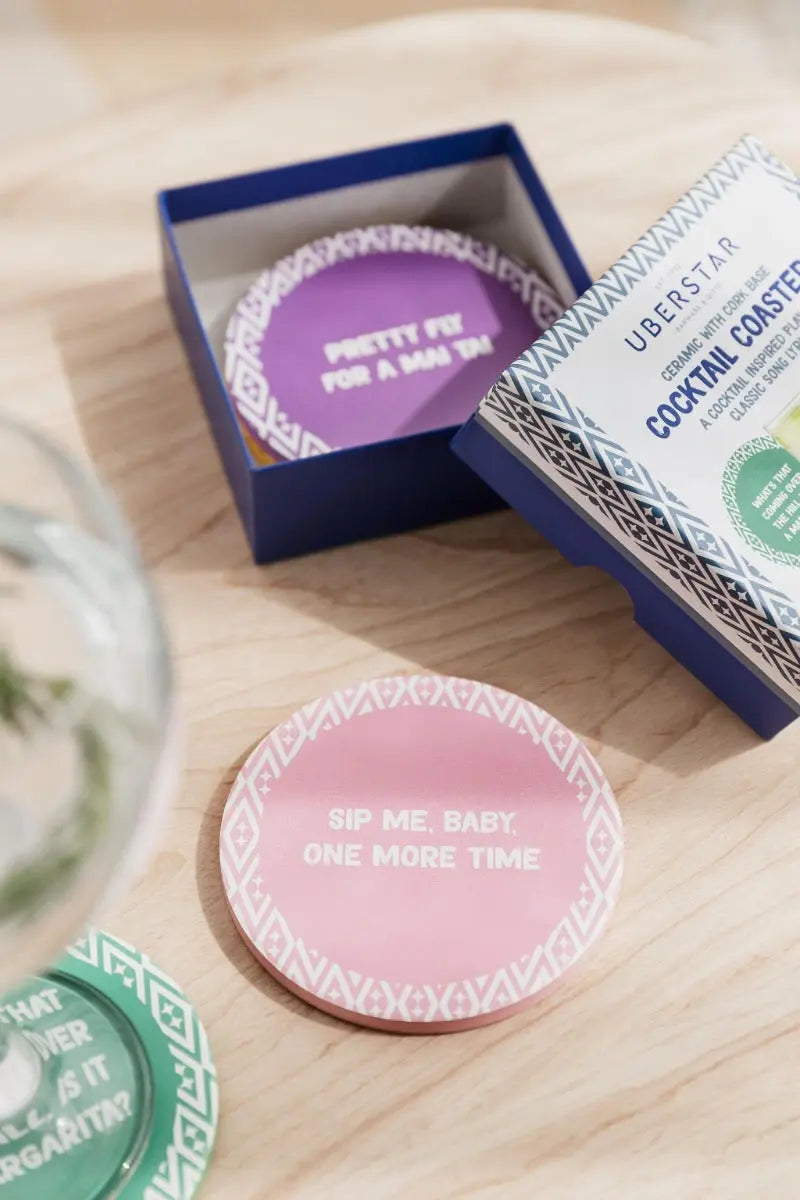 Die stilvollen Keramik-Untersetzer bringen mit humorvollen Cocktail-Sprüchen und einem schützenden Korkboden Spass und Funktionalität auf jeden Tisch. Perfekt für gesellige Anlässe, mit wasserabweisender Oberfläche und leicht zu reinigen.