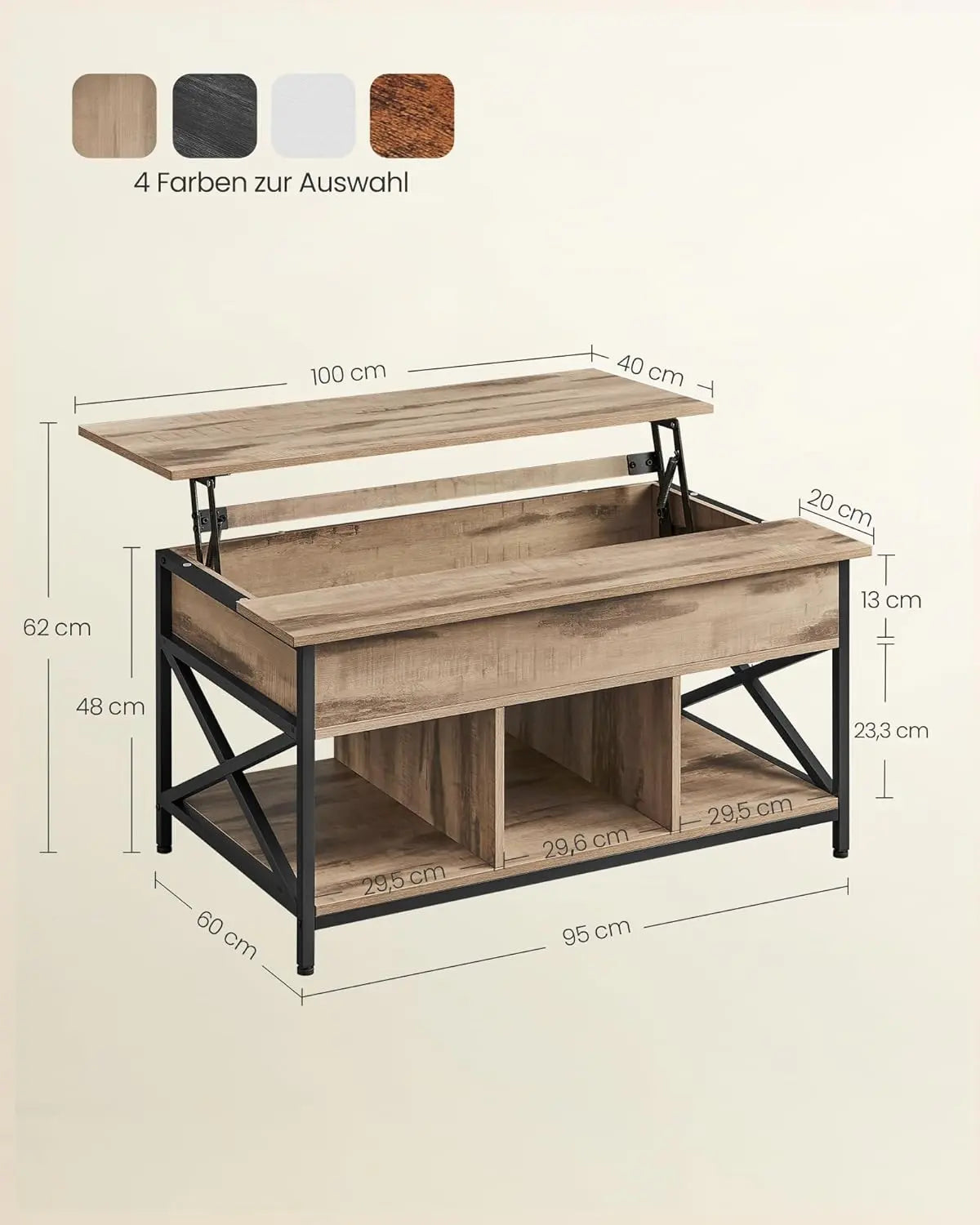 Hebeplatte verwandelt Tisch in bequemen Arbeits- und Essplatz, Verstecktes Fach plus drei offene Fächer für praktischen Stauraum, Stabile Konstruktion trägt bis 91 kg mit sanftem Heben dank Metallscharniere