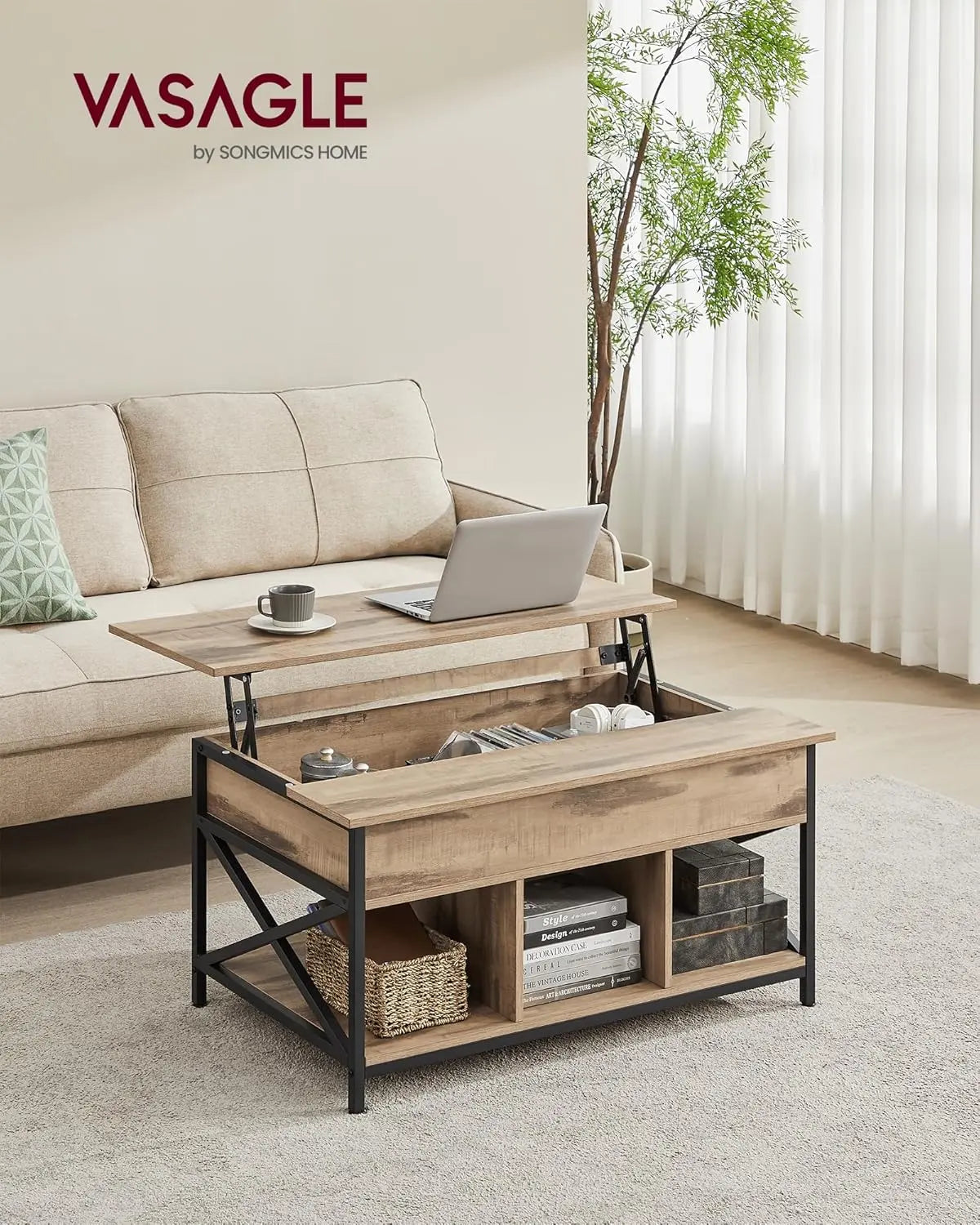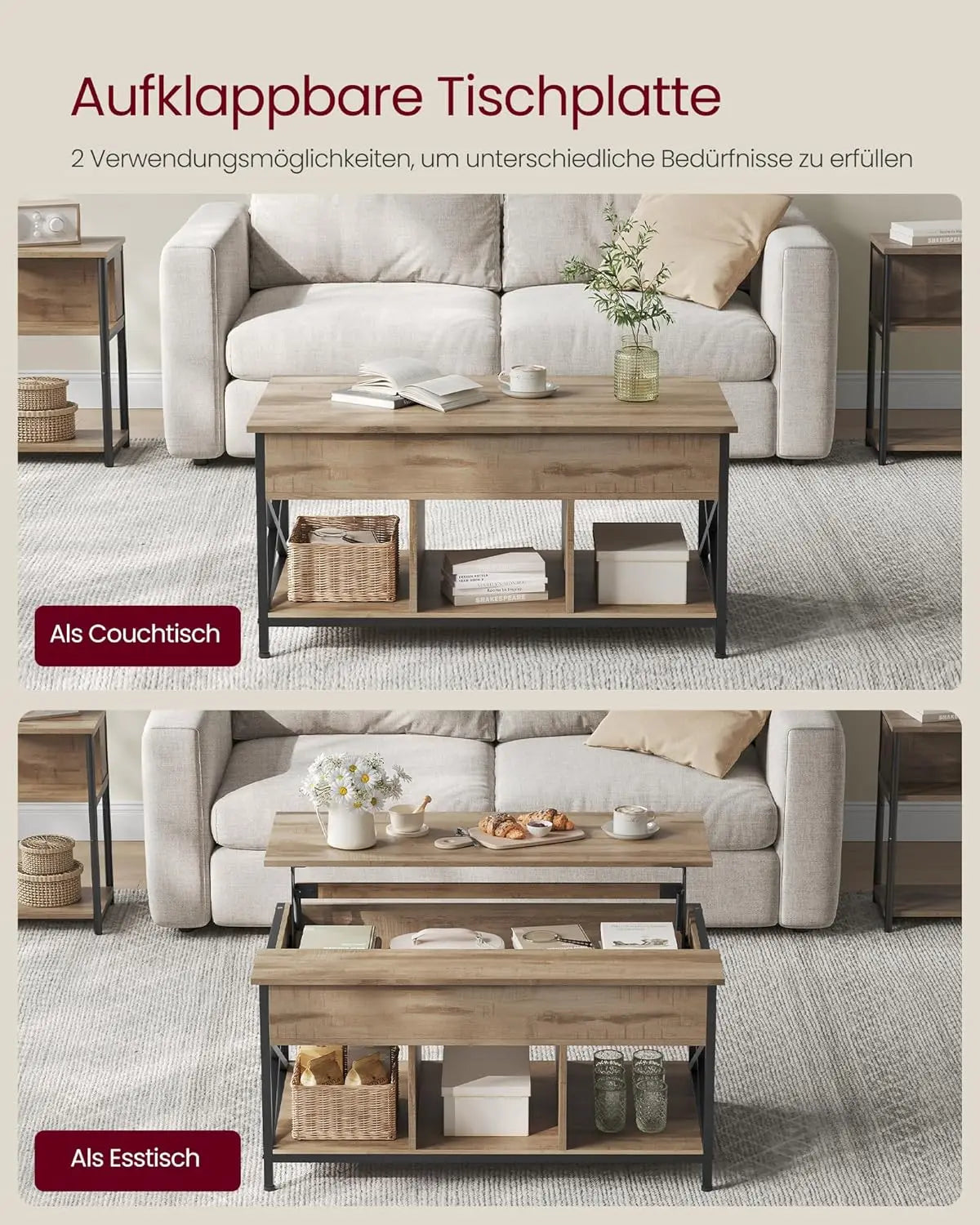 Der VASAGLE Couchtisch LCT205K50 in elegantem Kamelbraun-Schwarz vereint durchdachtes Design mit praktischer Funktionalität und hochwertiger Verarbeitung – ein vielseitiges Möbelstück, das Ihr Wohnzimmer sofort aufwertet. Mit den grosszügigen Massen von 60 x 100 x (48–62) cm (T x B x H) bietet die stabile Tischplatte aus Holzspanplatte ausreichend Fläche zum Abstellen von Kaffee, Dekoration oder Arbeitsmaterialien; durch das innovative Oberteil-anheben-Design hebt sich die Platte nach vorne und verwandelt den Tisch in eine komfortable Arbeits- oder Essofläche, so dass Sie bequem auf der Couch arbeiten, im Internet surfen, eine Mahlzeit geniessen oder basteln können.