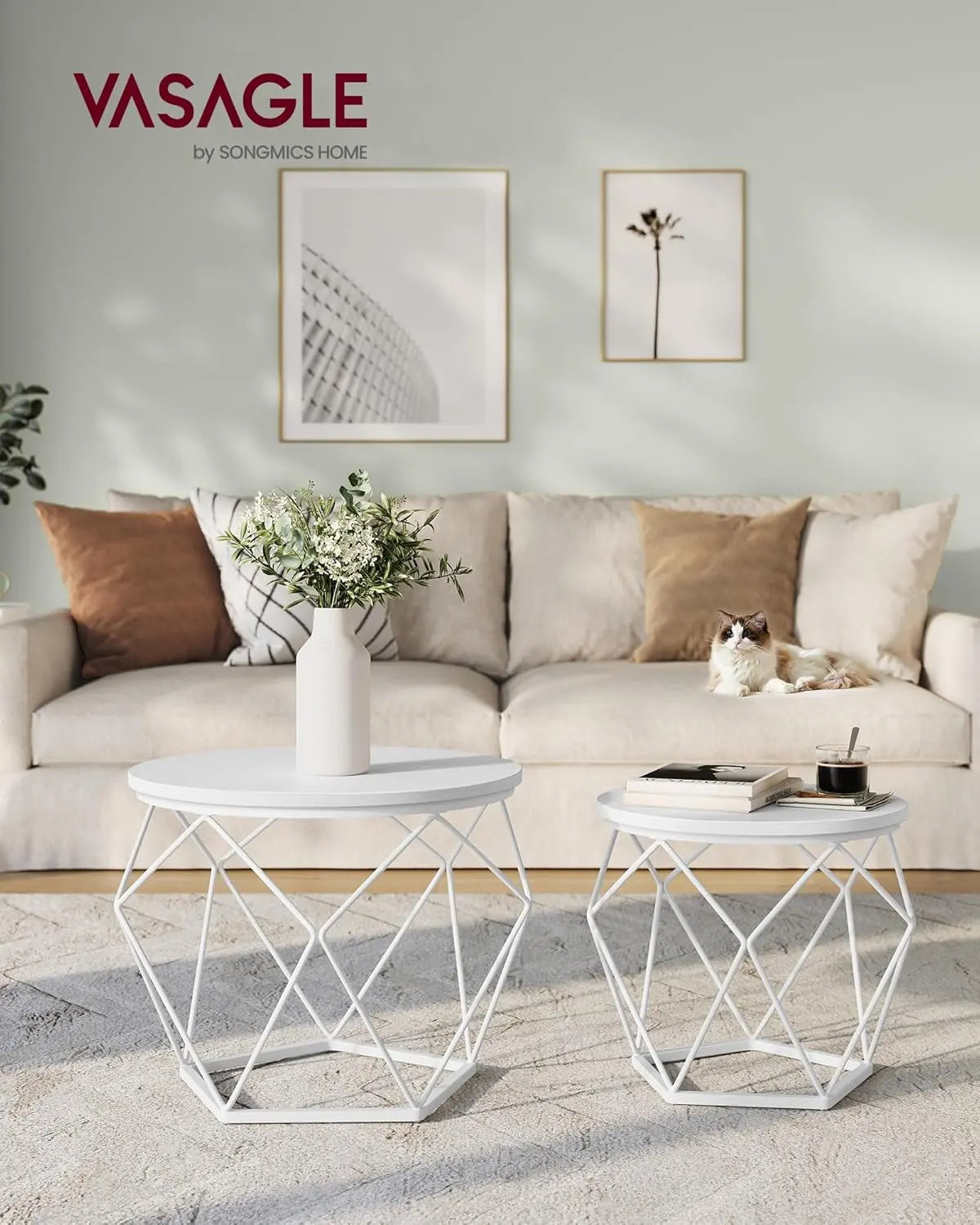 Der moderne Stil dieses Tisch-Sets verleiht Ihrem Raum einen besonderen Touch. Die runde Platte in schneeweiss und das geometrische Gestell aus wolkenweissem Stahl werden die Augen Ihrer Gäste zum Strahlen bringen. Setzen Sie Akzente in Ihrem Zuhause mit dem SONGMICS Couchtisch rund – stilvoll, praktisch und vielseitig!