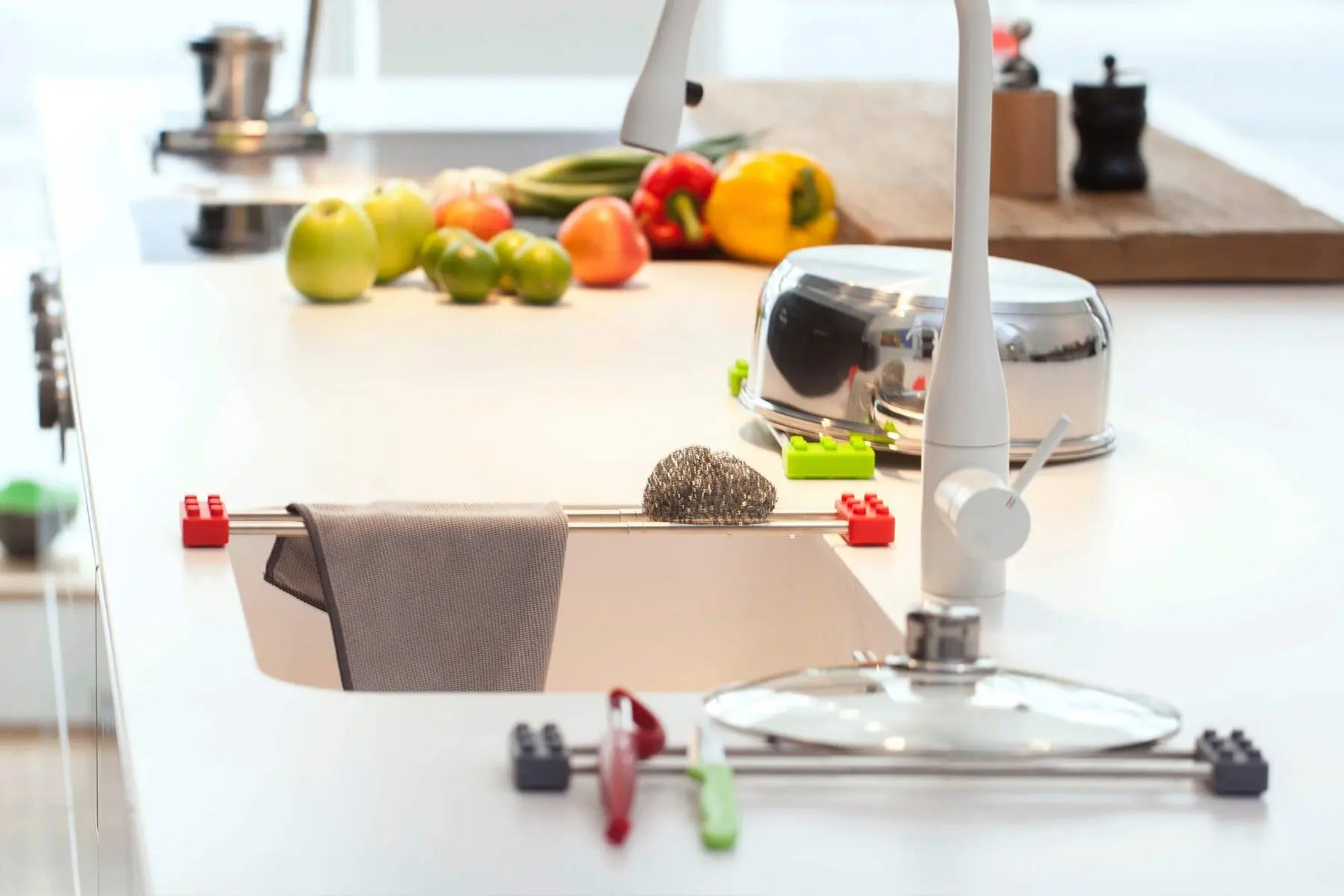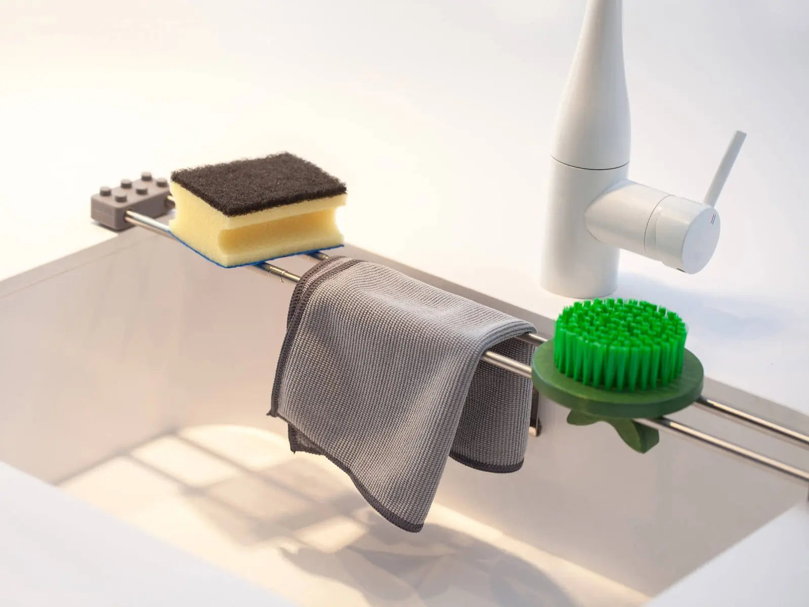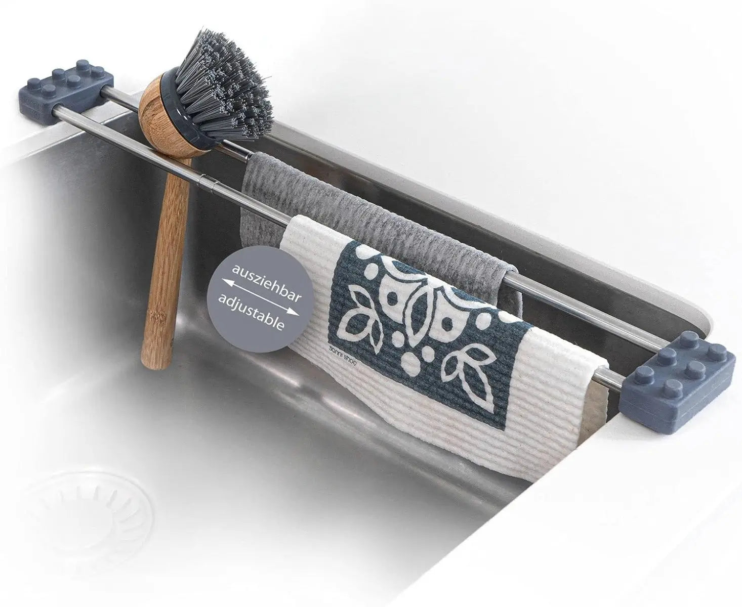 Dank Teleskopfunktion passt sich drip.line jeder Spüle an, und kann unkompliziert und ohne Befestigung einfach darüber gelegt werden. Zum Abtropfen von Spültuch, Schwamm oder Bürste.