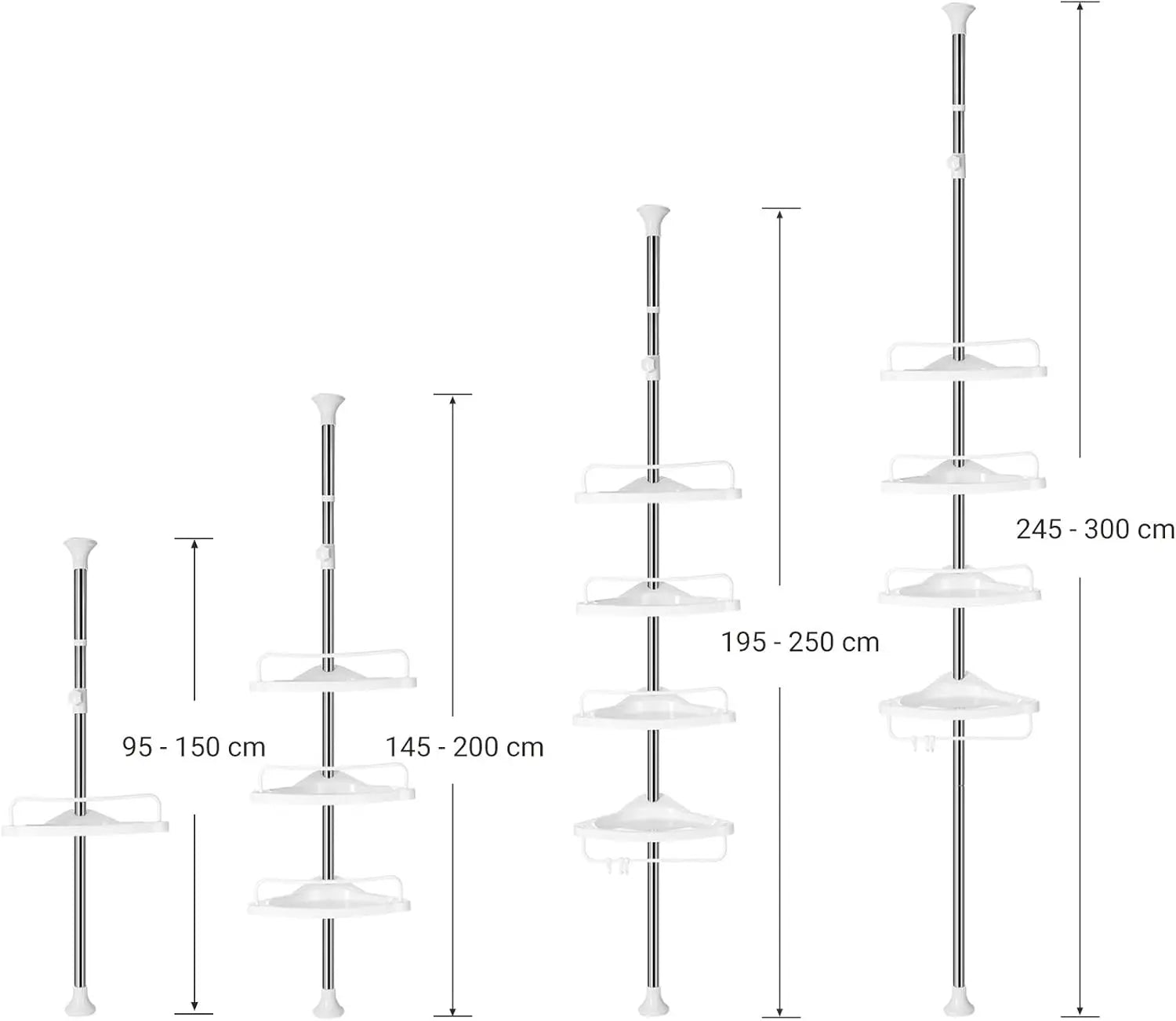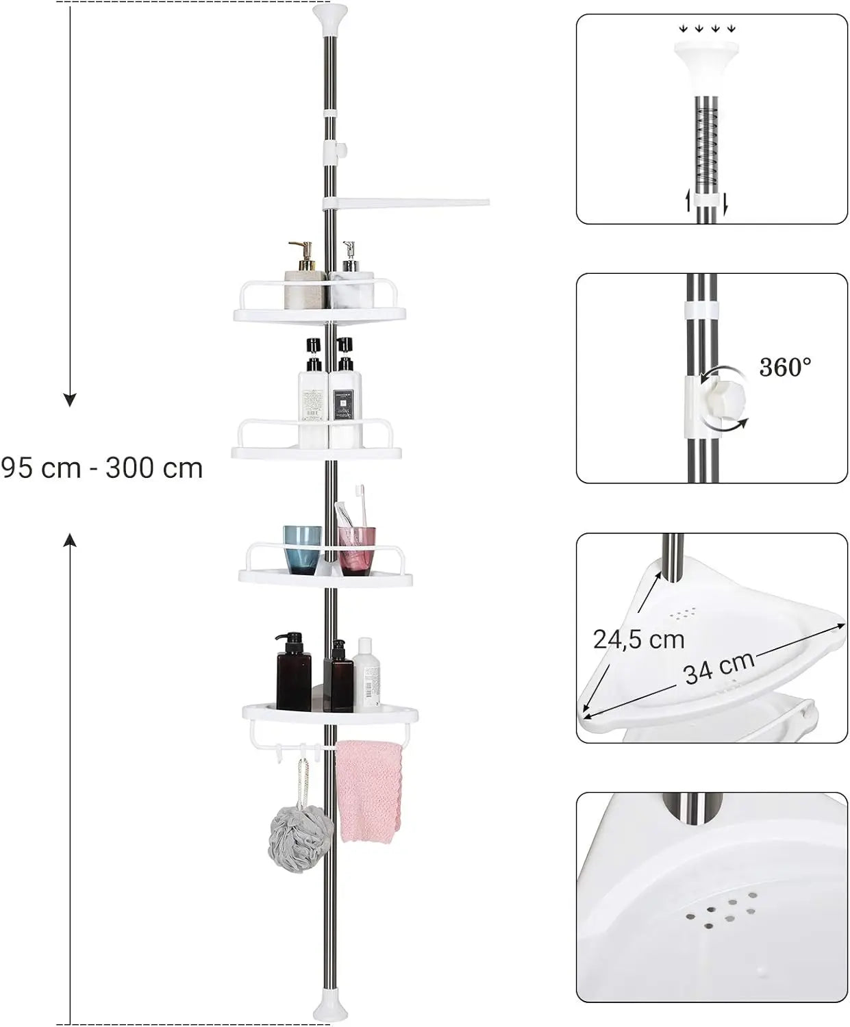 Bringen Sie Ordnung und Stil in Ihr Badezimmer mit dem höhenverstellbaren SONGMICS Duschregal BCB02SW: das platzsparende Eckregal in elegantem Weiss-Silber, gefertigt aus robustem 304-Edelstahl kombiniert mit hochwertigem PP-, ABS- und PVC-Kunststoff – korrosionsbeständig, langlebig und ideal für feuchte Umgebungen. Die teleskopierbare Standstange lässt sich stufenlos von 95 bis 300 cm an Ihre Deckenhöhe anpassen und steht dank der 7 cm grossen Gummifüsse sicher und rutschfest; das gesamte Regal wiegt nur 1,7 kg und ist trotzdem stabil konstruiert.