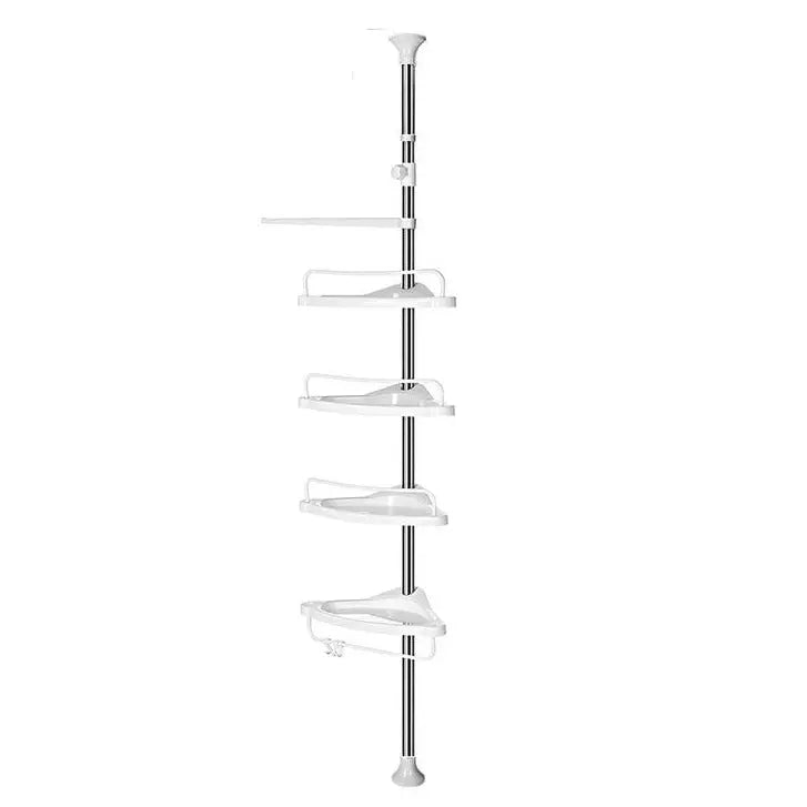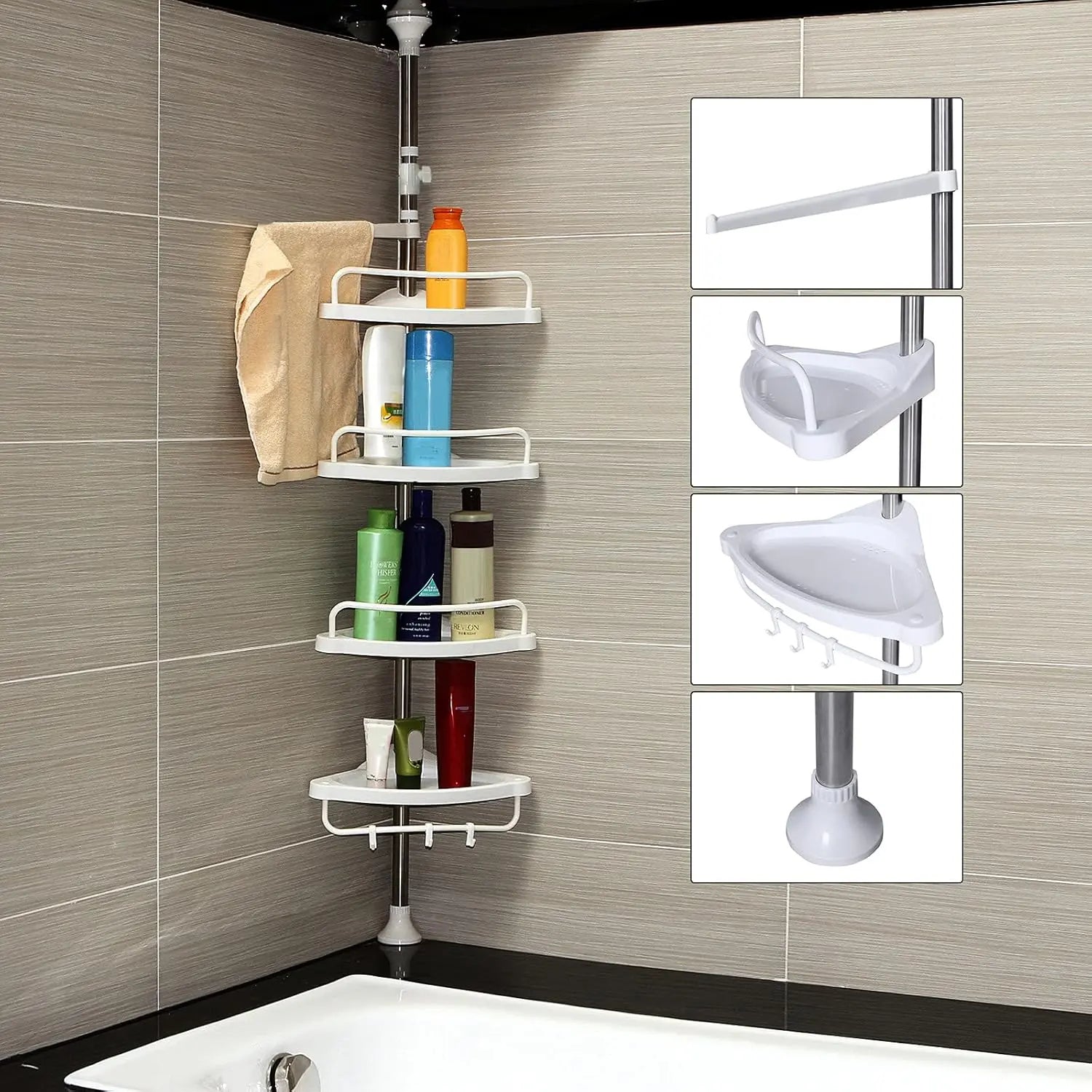 Vier variable Ablagen bieten reichlich Platz für Shampoo- und Duschflaschen, Seifen, Rasierapparate und Pflegeprodukte; jede Ablage trägt statisch bis zu 2 kg und verfügt über praktische Wasserablauflöcher, damit keine Feuchtigkeit stehen bleibt. Kleine, aber entscheidende Details: auf jeder Ebene schützt ein verschiebbarer Gummiring Ihr Zubehör vor Herunterrutschen und ermöglicht zugleich die einfache Höhenverstellung der Ablagen nach Bedarf. Zusätzlich verfügt das Eckregal über drei Haken für Duschschwämme oder Badeschuhe sowie einen praktischen Handtuchhalter – so sind alle Utensilien griffbereit und übersichtlich geordnet.