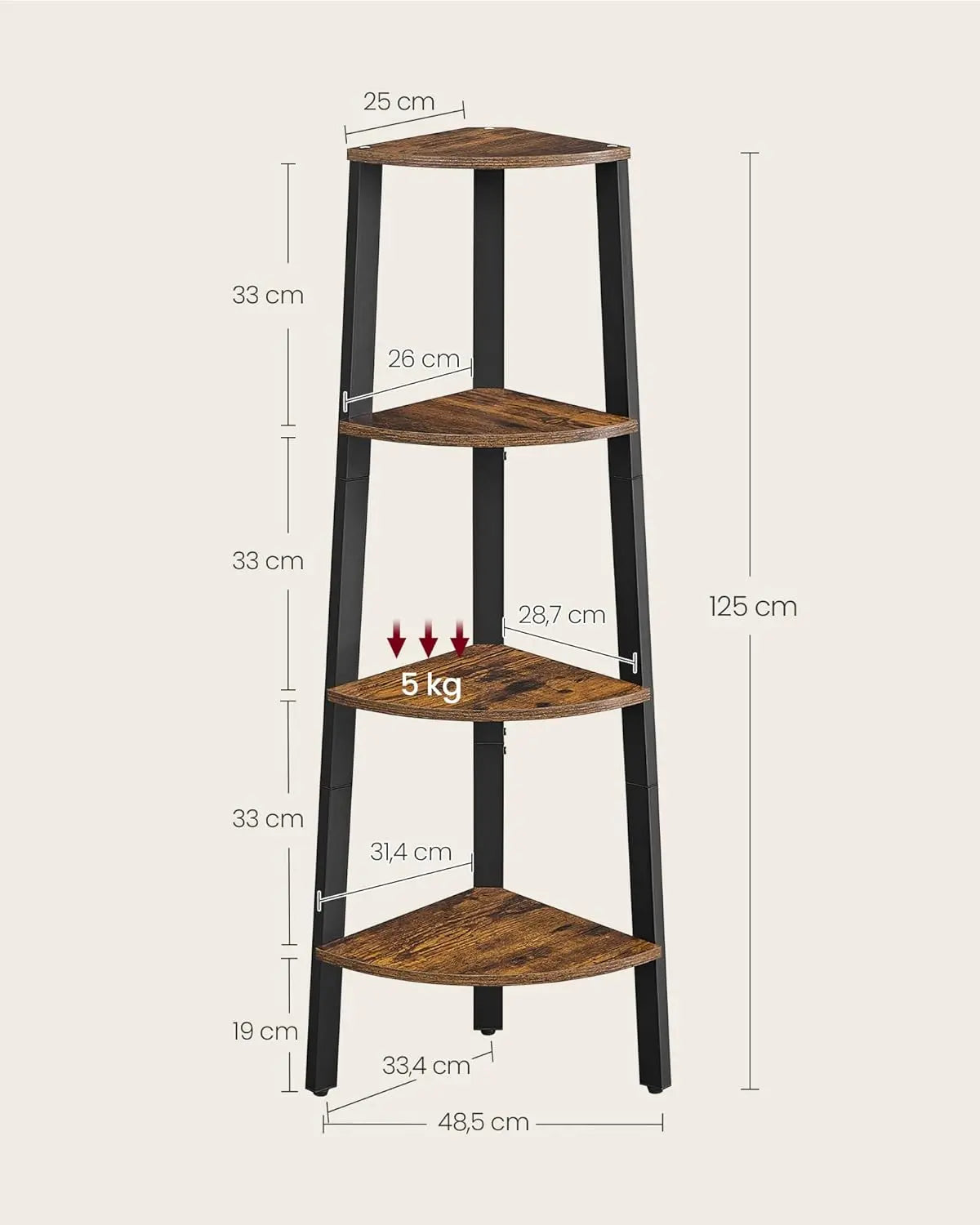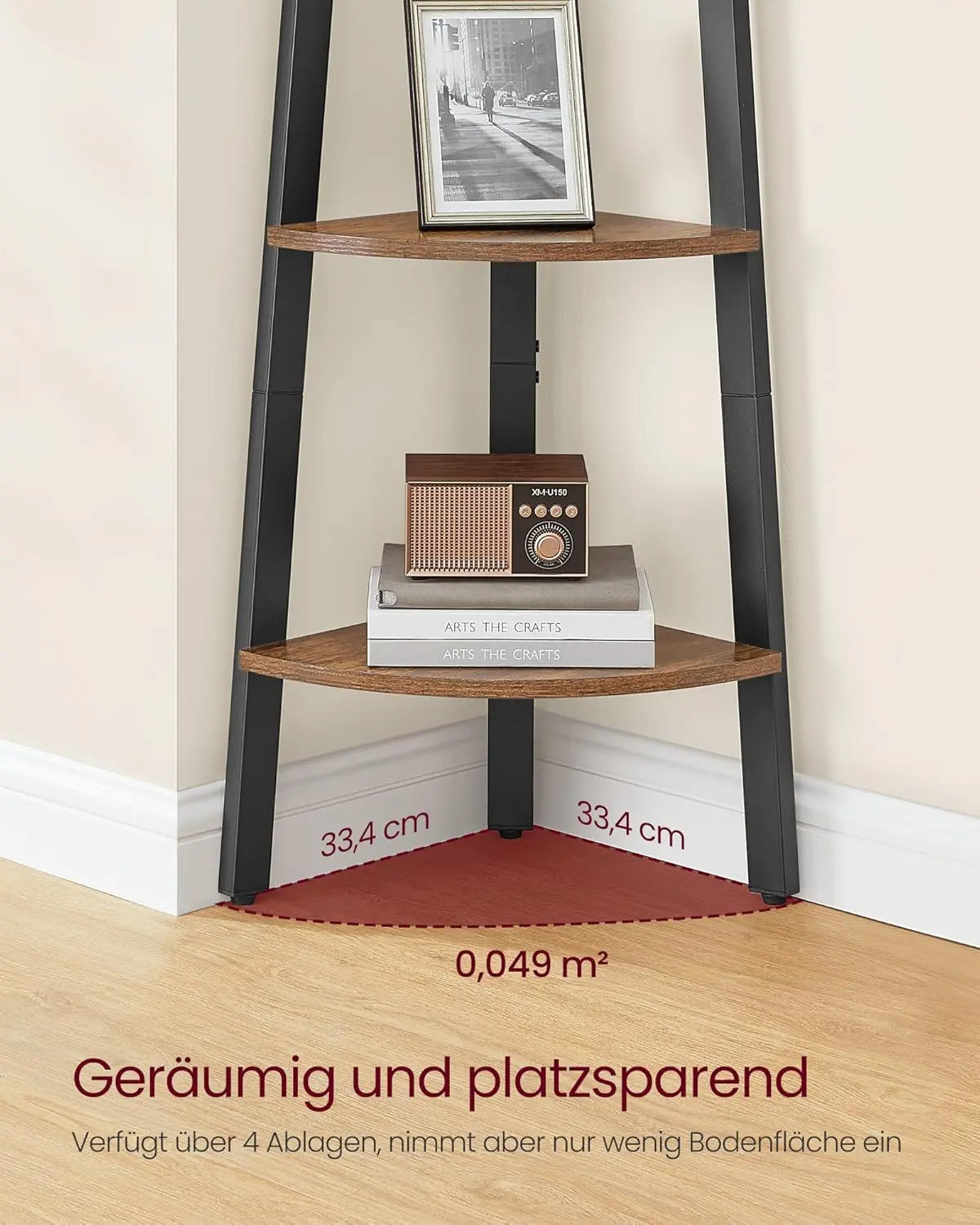 Platzsparendes Eckregal für optimale Raumausnutzung, Vier Ablagen für Bücher, Pflanzen und Deko, Stabile 3‑Bein-Konstruktion mit verstellbarem Fuß und Kippschutz