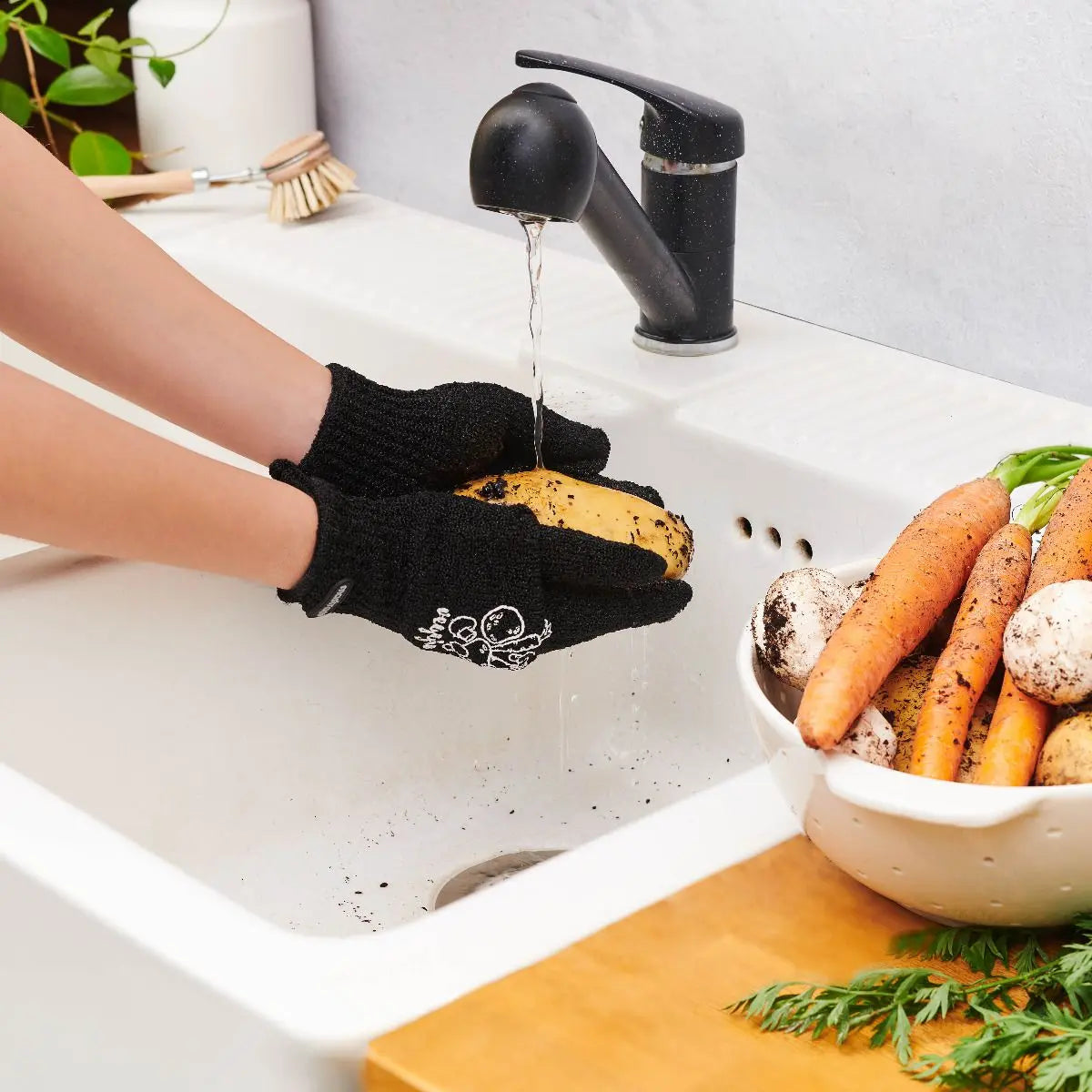 Die Anwendung ist spielerisch und macht sogar Kindern Spass, die aktiv beim Gemüseputzen mithelfen können. Dank des cleveren Designs bieten die Handschuhe eine sichere und effektive Methode, um Schmutz und Ablagerungen zu entfernen, ohne das Gemüse zu beschädigen. Sie sind einfach zu verwenden, langlebig und eine praktische Ergänzung für jede Küche.