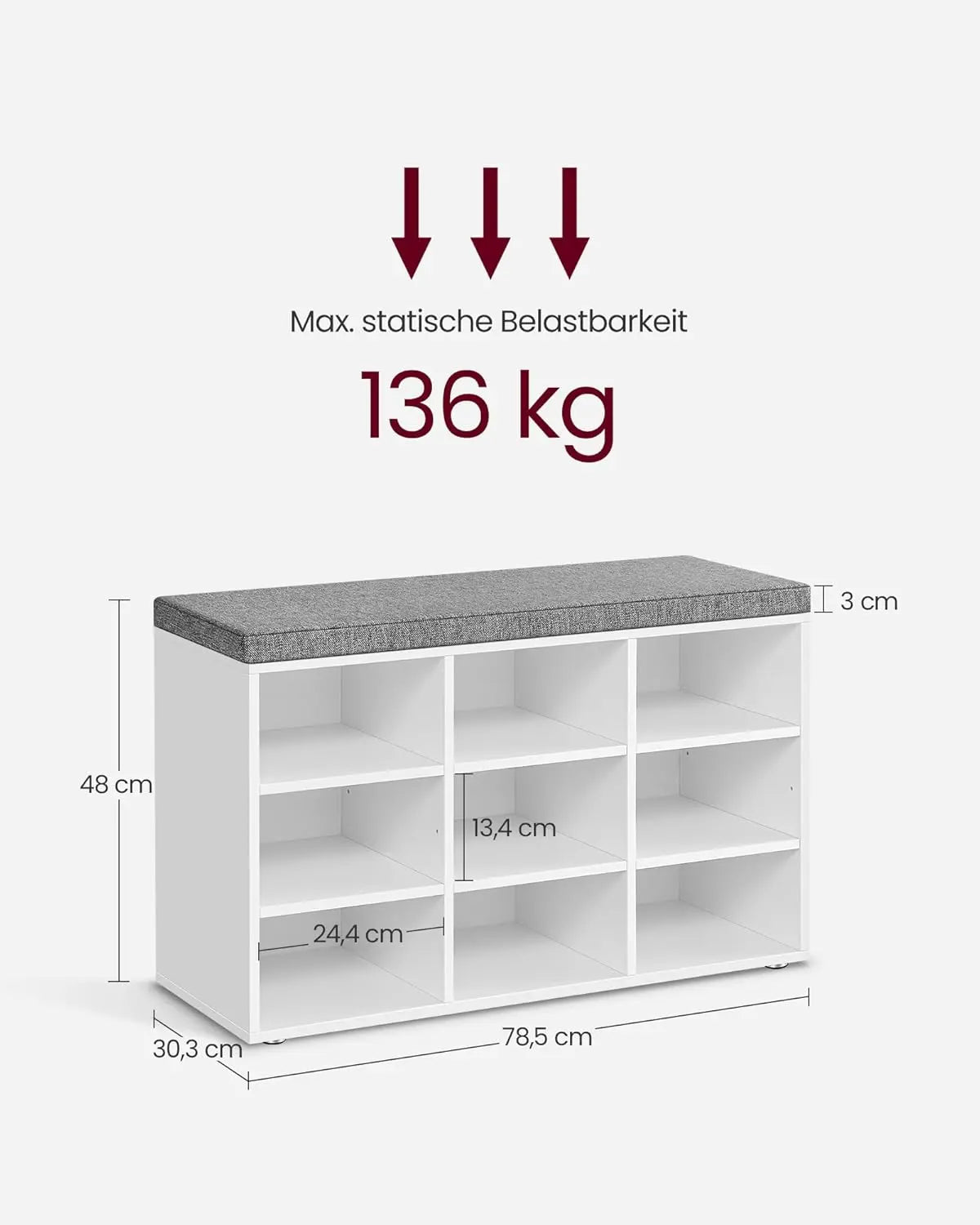 Platz für bis zu 9 Paar Schuhe in 9 Fächern, Verstellbare und herausnehmbare Ablagen für Stiefel und Aufbewahrungsboxen, Stabil und belastbar bis 136 kg mit abnehmbarem Sitzkissen