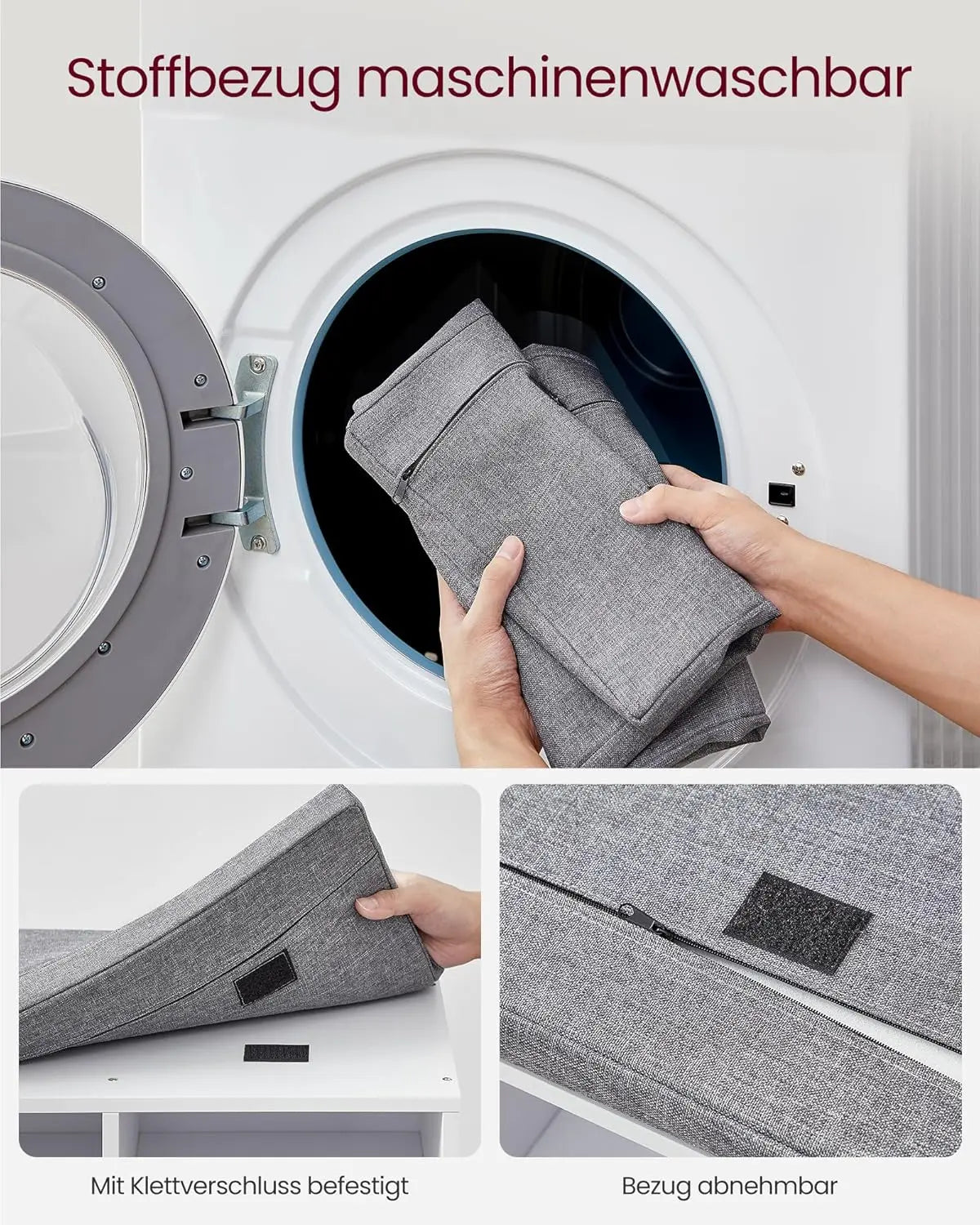 Kunden sind begeistert von der gelungenen Kombination aus Stil und Funktionalität: viel Stauraum für bis zu 9 Paar Schuhe, verstell- und herausnehmbare Fächer, robustes Design (bis 136 kg), abnehmbares, bequemes Leinenkissen, Bodenschutz durch Fußpads und die kinderleichte Montage.