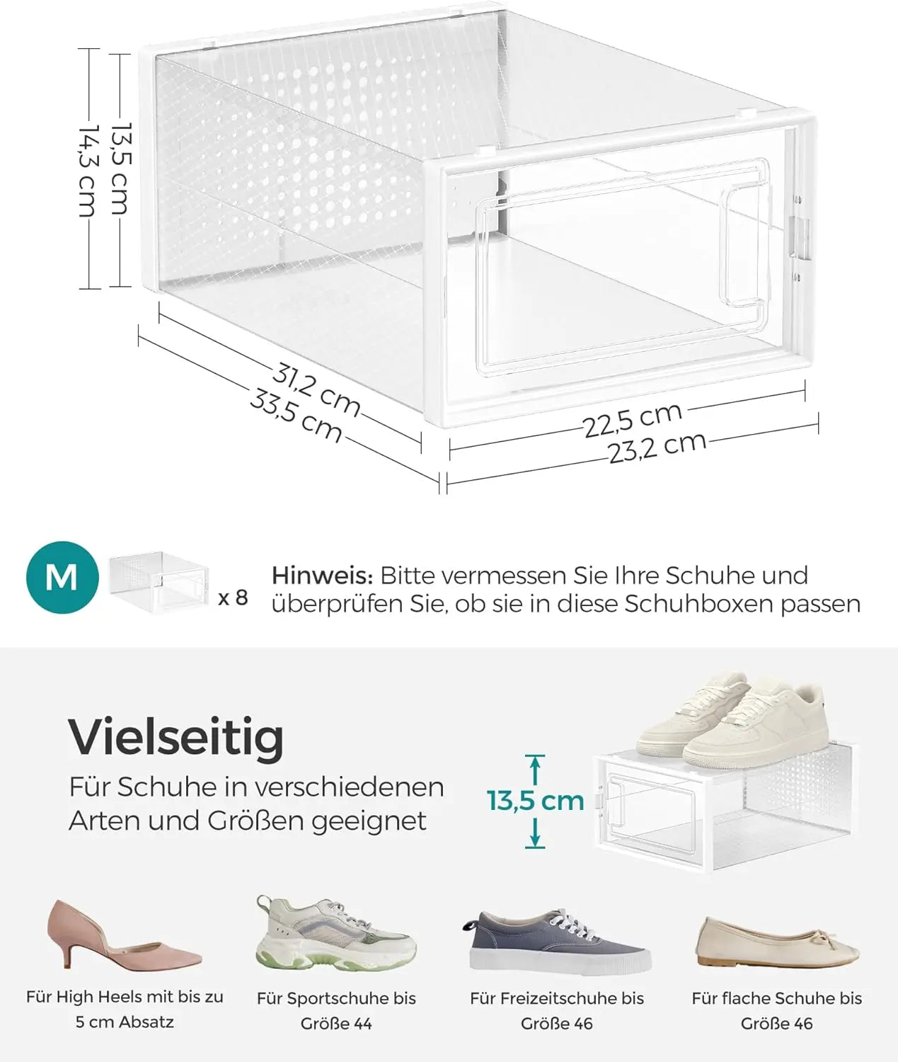 Schluss mit dem Schuhchaos: Das 8er-Set SONGMICS Schuhboxen (Modell LSP08SWT) in modernem Transparent-Weiss bietet Ihnen eine durchdachte, platzsparende und optisch klare Lösung zur Aufbewahrung Ihrer Schuhe – hergestellt aus robustem PP-Kunststoff (Gehäuse und Fronttür) mit stabilem ABS-Rahmen, überzeugt jede Box durch eine hochwertige Verarbeitung und ein geringes Gesamtgewicht von nur 2,4 kg pro Set, sodass Sie die Boxen einfach handhaben und platzieren können. Mit einer Aussenmaßeinheit von 33,3 x 23 x 14 cm und einer grosszügigen Innenfläche von 30 x 22,5 x 13,5 cm (innen praktischerweise oft angegeben mit 31,2 x 22,5 x 13,5 cm) bieten die Boxen ausreichend Platz für Turnschuhe, Pumps oder Flats bis Grösse 44 und sorgen dank der durchsichtigen Fronttür dafür, dass Sie jedes Paar sofort erkennen, ohne jede Kiste öffnen zu müssen.