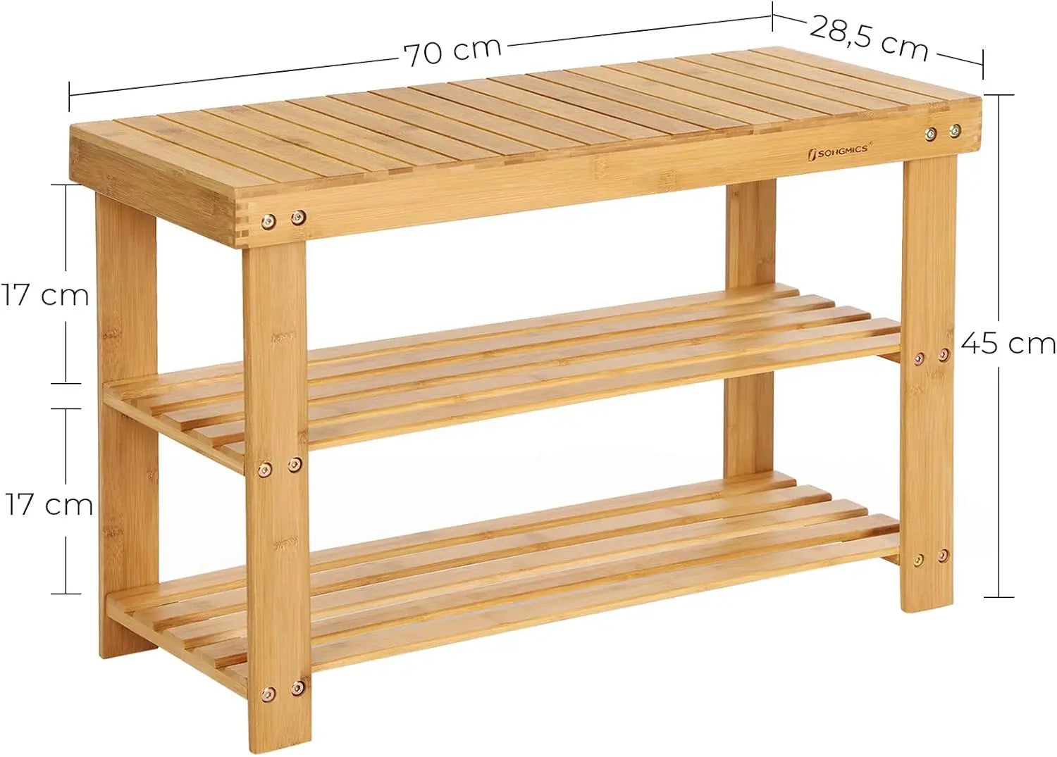 Mit seinen kompakten Massen von 70 x 28 x 45 cm passt das Schuhregal ideal in Flur, Bad, Wohnzimmer oder Diele. Die zwei stabilen Bambusablagen bieten ausreichend Platz für mindestens 6 Paar Schuhe und sorgen für Ordnung, während die oberste Ablage perfekt ist, um Ihre Arbeitstasche oder Ihr Portemonnaie abzulegen.