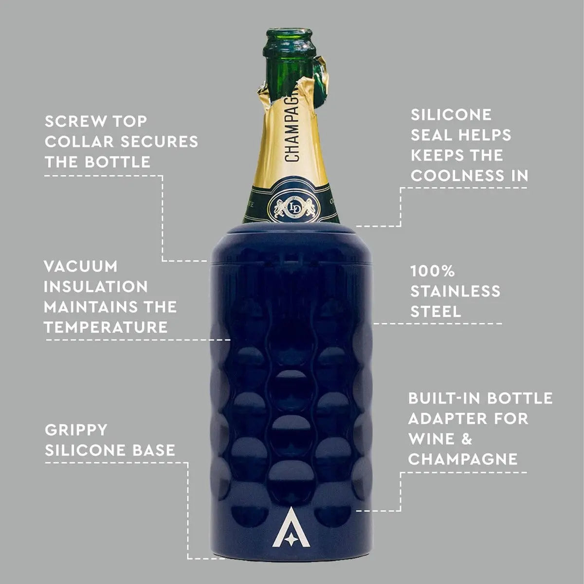 Der Kühler verfügt über einen Schraubverschluss, der die Kälte im Inneren hält und gleichzeitig das Eindringen von Wärme verhindert. Ein integrierter Adapter ermöglicht die Kompatibilität sowohl mit Wein- als auch mit Champagnerflaschen. Zudem schützt eine gummierte Basis den Untergrund und bietet zusätzliche Stabilität.