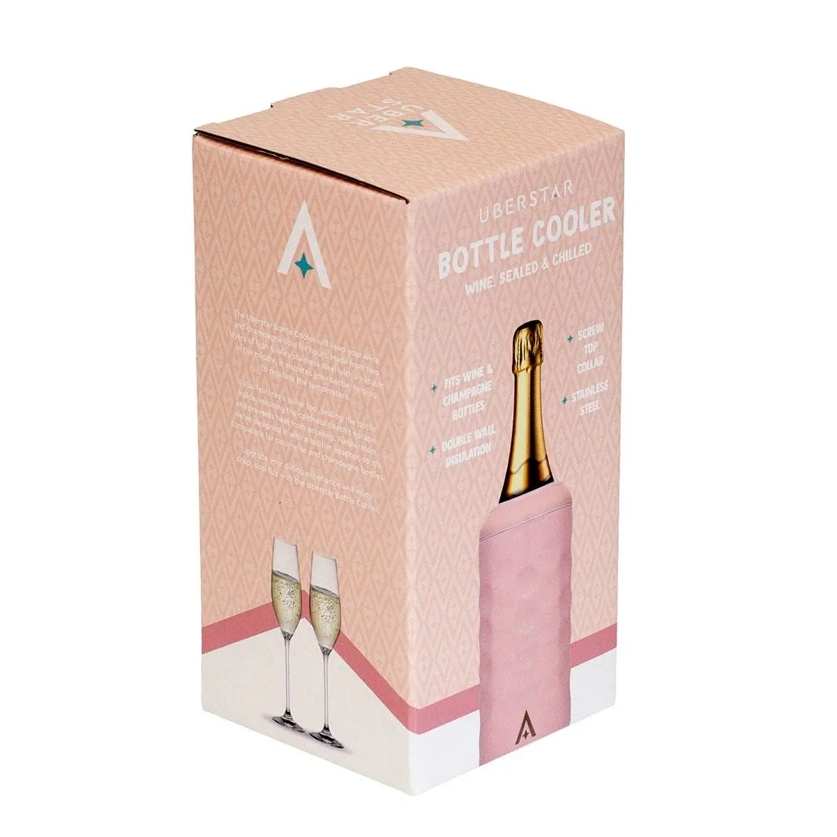 Der Kühler verfügt über einen Schraubverschluss, der die Kälte im Inneren hält und gleichzeitig das Eindringen von Wärme verhindert. Ein integrierter Adapter ermöglicht die Kompatibilität sowohl mit Wein- als auch mit Champagnerflaschen. Zudem schützt eine gummierte Basis den Untergrund und bietet zusätzliche Stabilität.