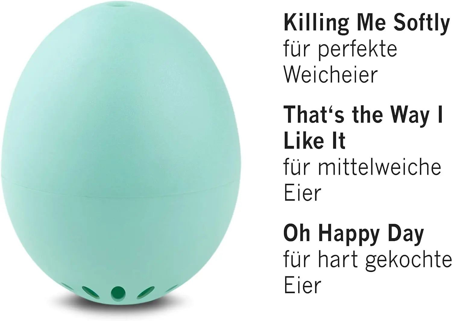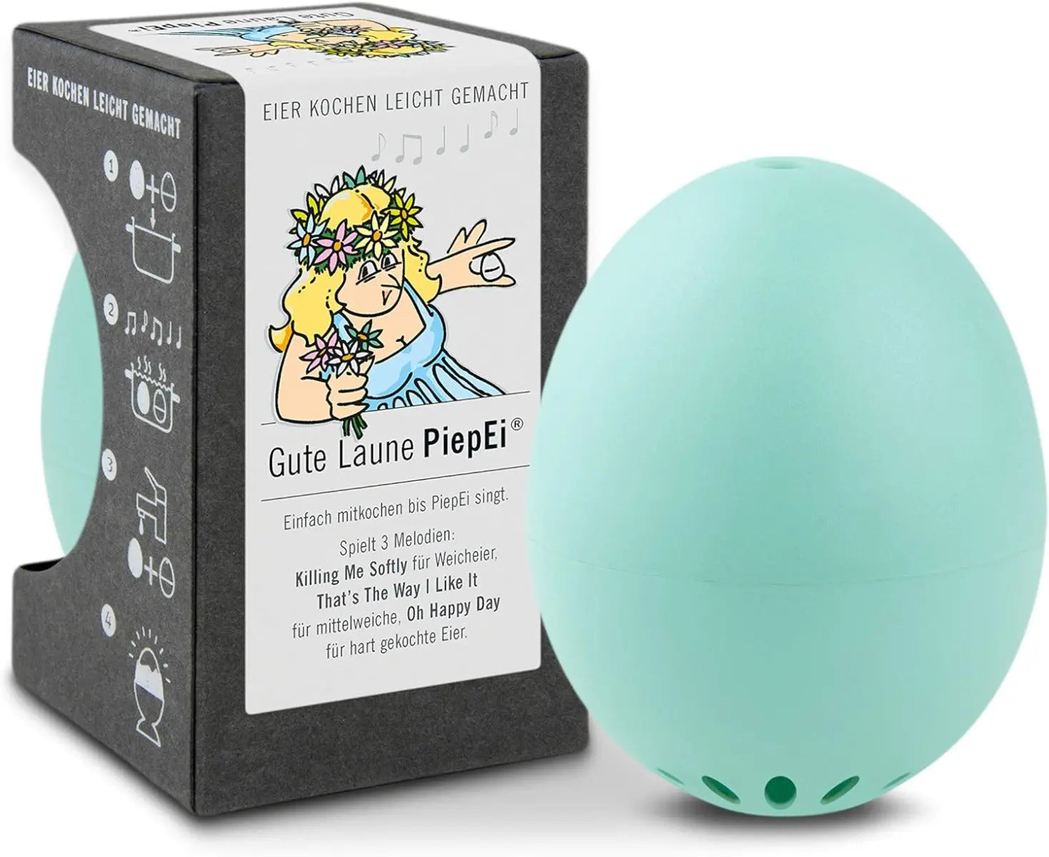 Drei Melodien für drei Härtegrade: Das Gute Laune PiepEi spielt 3 verschiedene Melodien: „Killing Me Softly“ für perfekte Weicheier, „That‘s the Way I Like It“ für perfekte mittelweiche Eier und „Oh Happy Day“ für perfekte harte Eier.