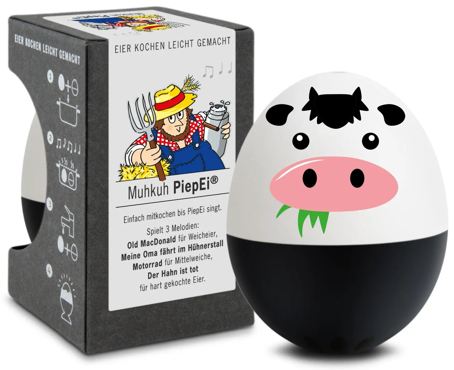 Drei Melodien für drei Härtegrade: Ob weich, mittelweich oder hart gekocht, Muhkuh PiepEi spielt für jede Stufe eine andere Melodie. "OLD MAC DONALD" für weich gekochte Eier, "MEINE OMA FÄHRT IM HÜHNERSTALL MOTORRAD" für das perfekte mittelweiche Ei und "DER HAHN IST TOT" sobald das hart gekochte Ei fertig ist.