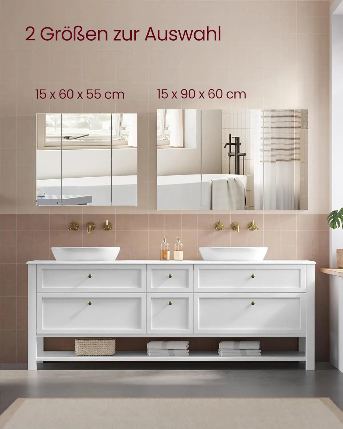 Die drei grossen Spiegel, die die Türen des Schranks zieren, sind nicht nur praktische Helfer beim täglichen Styling, sondern schaffen auch einen beeindruckenden Tiefeneffekt in Ihrem Raum. Mit den kompakten Massen von 60 x 15 x 55 cm bietet dieser Spiegelschrank dennoch ausreichend Stauraum. Hinter den Türen verbergen sich drei verstellbare Einlegeböden, die in drei Höhen angepasst werden können – ideal für die Aufbewahrung von Cremes, Shampoos, Kämmen oder Toilettenpapier.