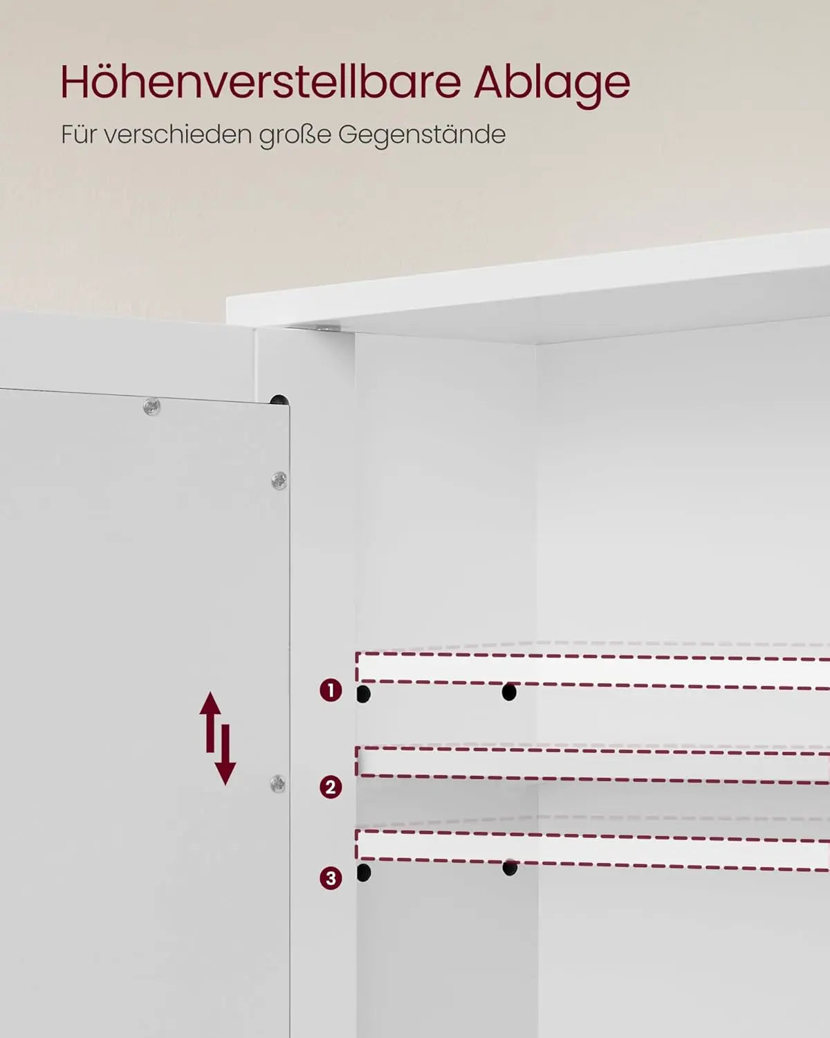 Der Spiegelschrank bietet nicht nur Funktionalität, sondern auch Flexibilität. Das höhenverstellbare Regal hinter den Türen lässt sich in drei Stufen anpassen, sodass Sie sowohl kleine als auch grosse Pflegeprodukte problemlos unterbringen können. Keine Sorge mehr, wenn Ihre Shampooflasche nicht passt – hier findet alles seinen Platz!