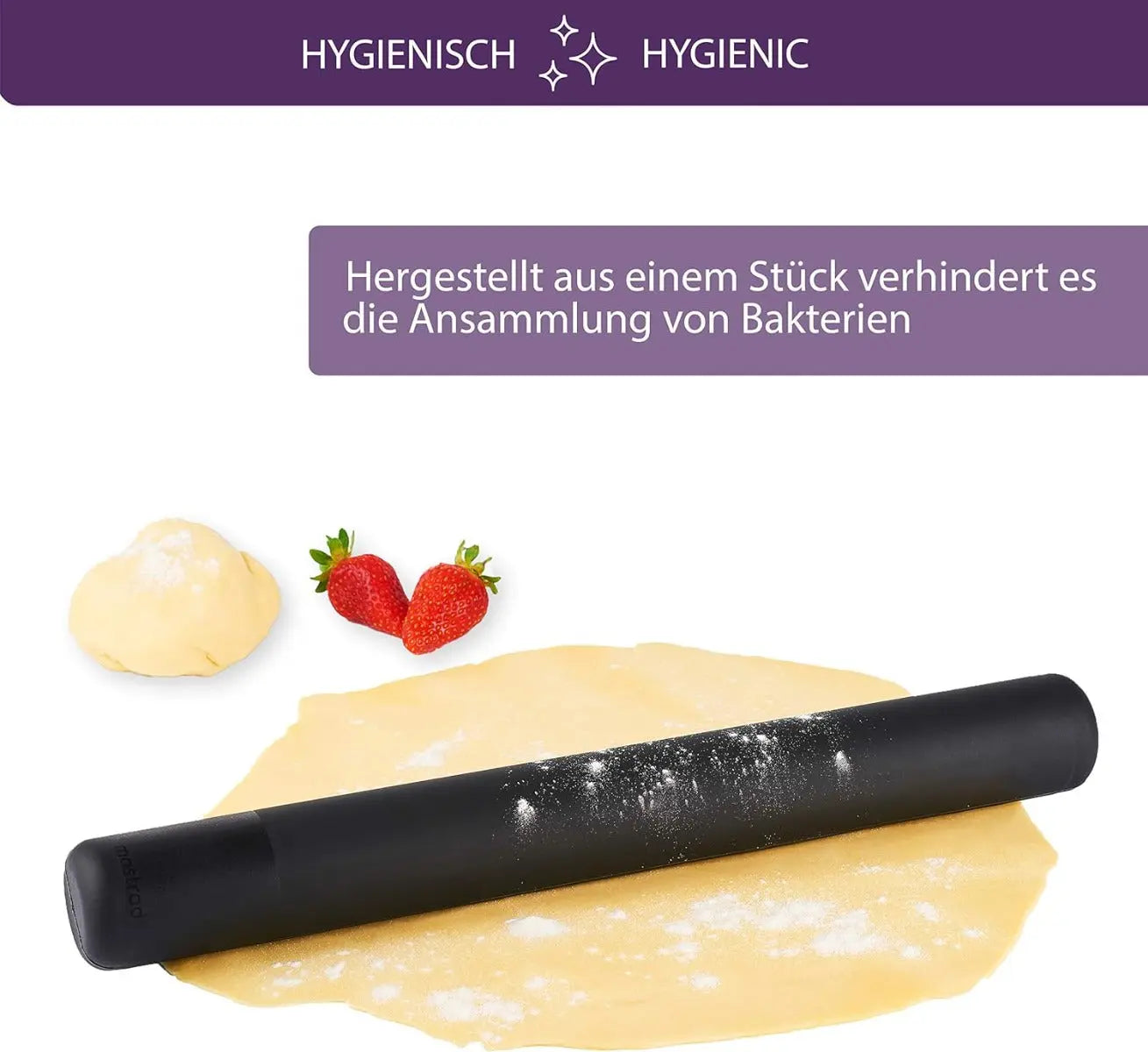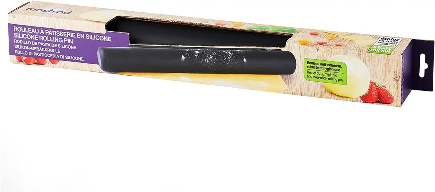 Die "Teigrolle Silikon Schwarz" von Mastrad ist ein hochwertiges Nudelholz, das speziell für die anspruchsvollen Bedürfnisse von Hobbybäckern und Profis entwickelt wurde. Mit einer Länge von 41 cm und einem Gewicht von 753 Gramm ist diese Teigrolle ideal für die Herstellung von Kuchen, Keksen, Pizzen und mehr. Die Rolle ist aus BPA-freiem Silikon gefertigt und bietet eine hervorragende Anti-Haft-Beschichtung, die das Festkleben von Teig verhindert und somit das Ausrollen erheblich erleichtert. Die einfache Handhabung und die spezielle Anti-Haft-Oberfläche sorgen dafür, dass der Teig gleichmäßig und ohne Anstrengung ausgerollt werden kann. Nach dem Gebrauch lässt sich die Teigrolle mühelos reinigen, da sie spülmaschinenfest ist. Dies spart Zeit und garantiert eine hygienische Aufbereitung für den nächsten Einsatz. Mastrad, bekannt für qualitative Küchengeräte in kreativem Design, steht seit über 25 Jahren für Innovation und Benutzerfreundlichkeit. Die "Teigrolle Silikon Schwarz" ist ein weiteres Beispiel für das Engagement der Marke, den Küchenalltag durch innovative Produkte zu erleichtern. Mit ihrem schicken Design und der praktischen Funktionalität ist diese Teigrolle eine Bereicherung für jede Küche und unterstützt Sie dabei, perfekte Ergebnisse bei der Teigzubereitung zu erzielen.
