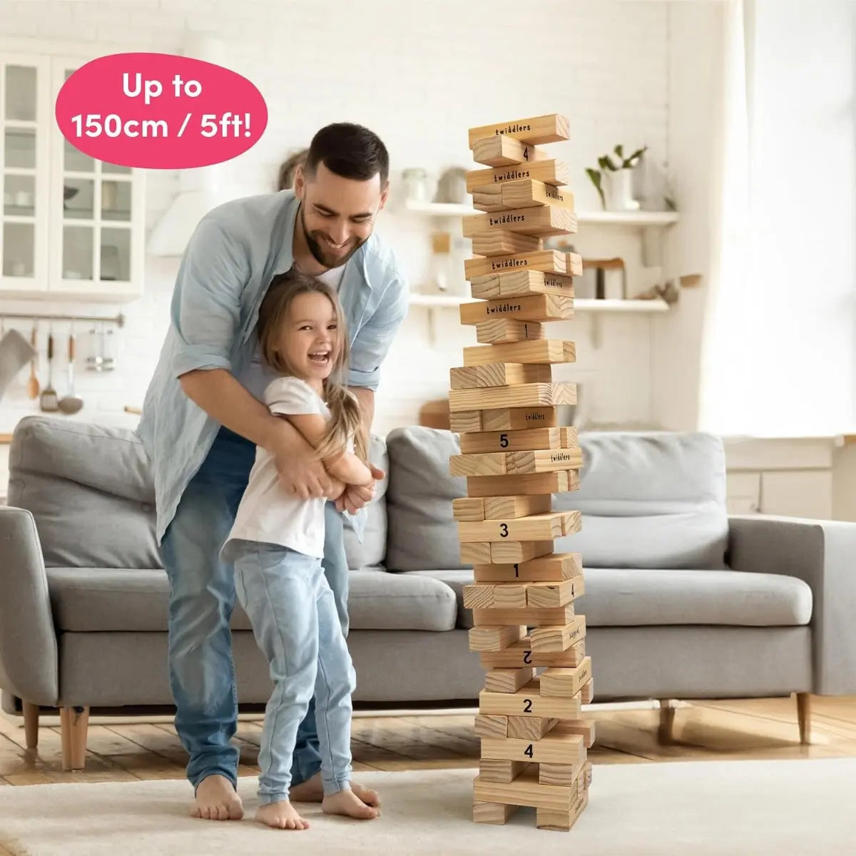 Nervenkitzel durch 152 cm Höhe, Kreative Spielvarianten mit Twiddlers-Logo und Zahlen, Robuste Holzblöcke für zahlreiche Spielrunden