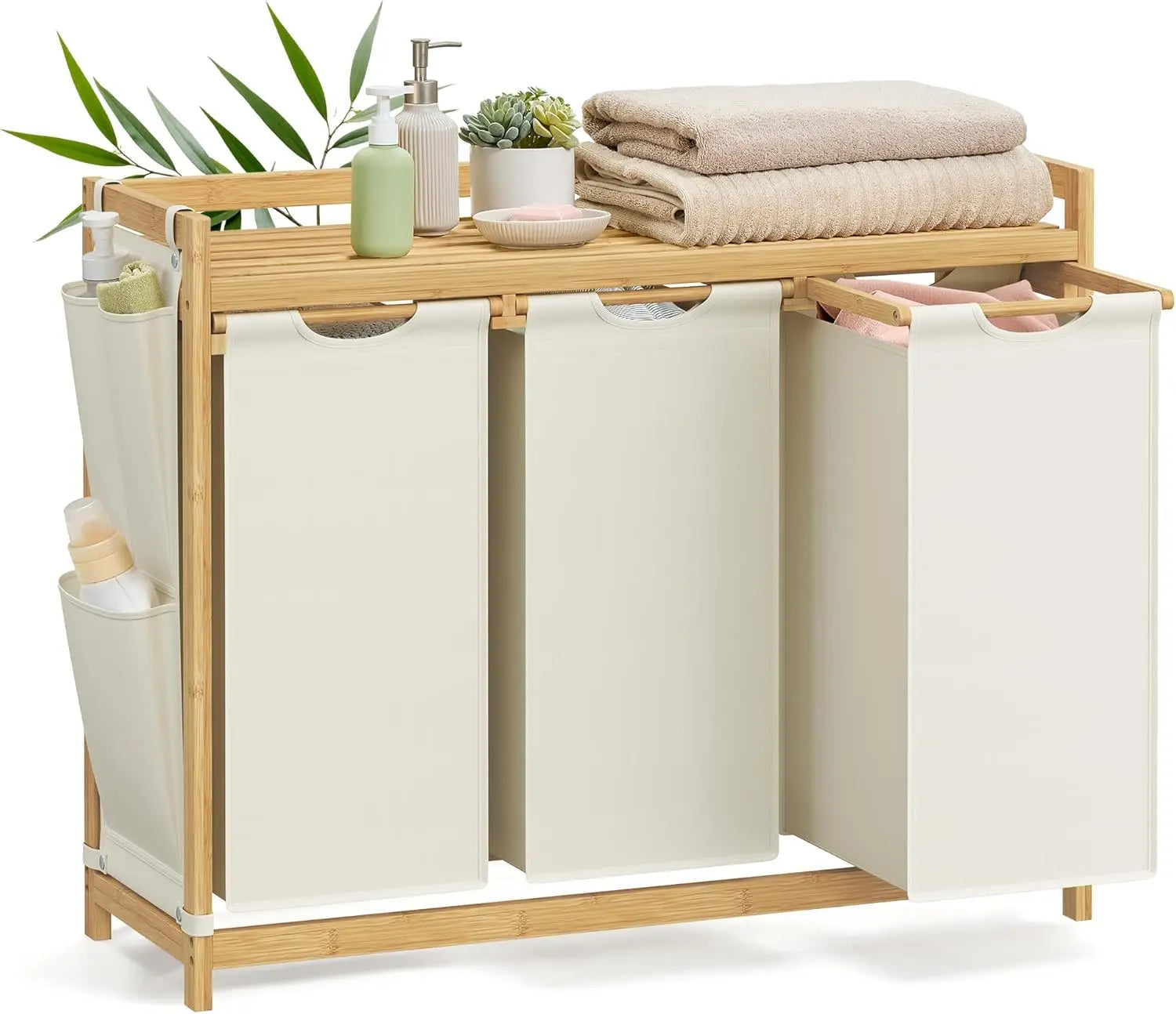 Drei Fächer mit 150 l Gesamtkapazität für einfache Wäschetrennung, Obere Ablage und Seitentaschen für Waschmittel & Zubehör, Ausziehbare abnehmbare Wäschesäcke mit Kunststoff-Bodenplatte und Klettverschlüssen