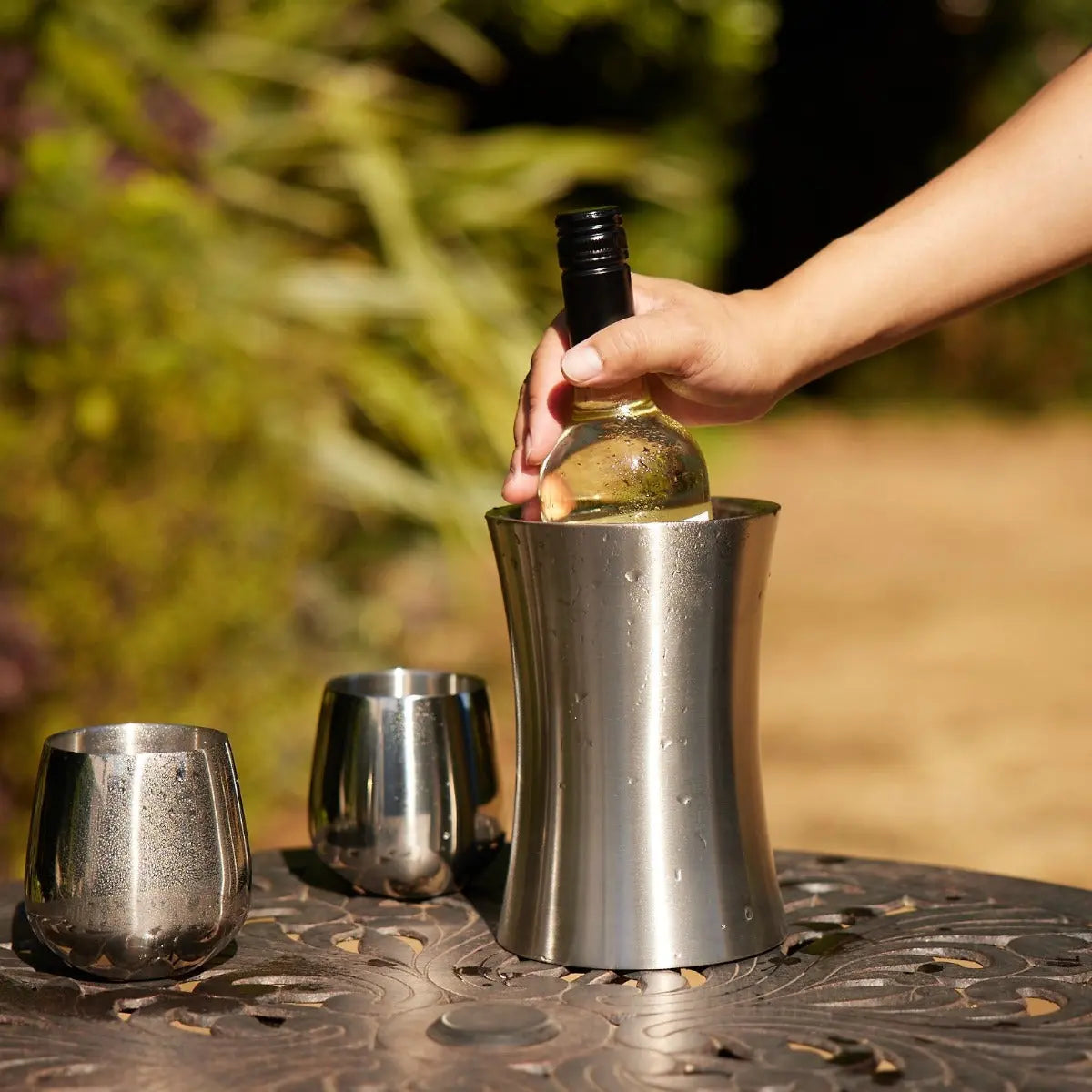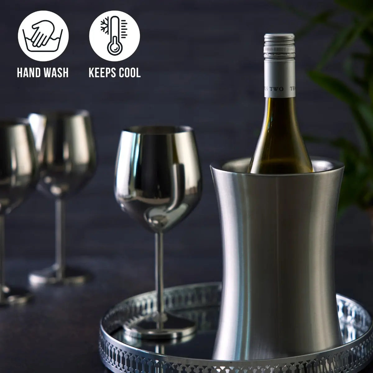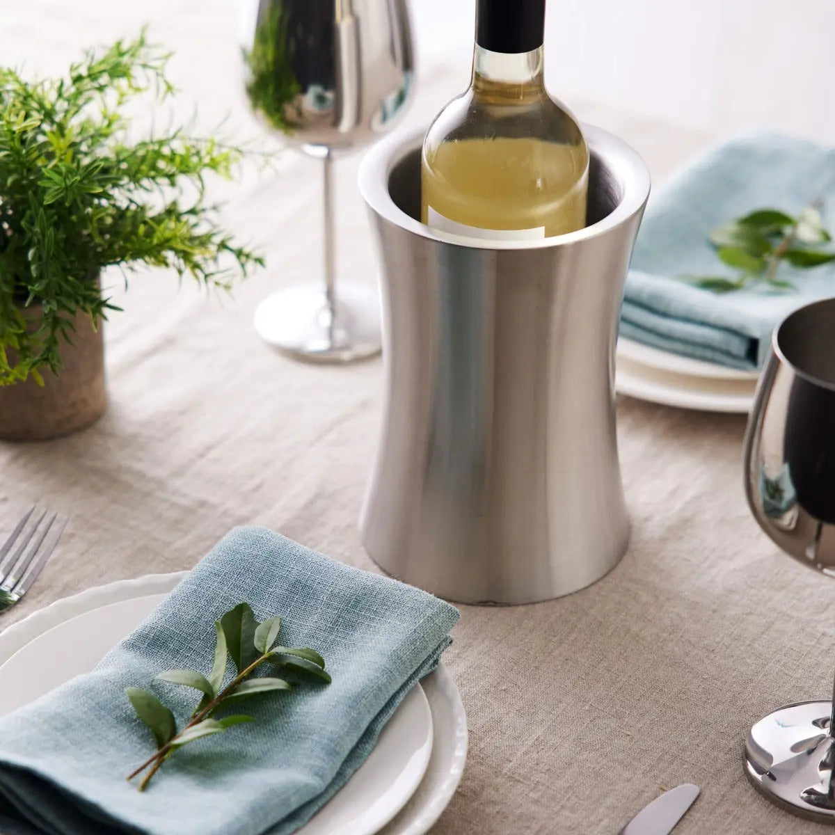 Der Edelstahl-Weinkühler kombiniert stilvolles Design mit praktischer Funktionalität. Mit einer doppelwandigen Isolierung ausgestattet, hält er Wein und Champagner über längere Zeit optimal gekühlt, ohne dass Eis benötigt wird. Das schlanke, gebürstete Edelstahlgehäuse sorgt dafür, dass der Kühler nicht nur elegant aussieht, sondern auch keinen Kondensationsschmutz hinterlässt. Leicht und tragbar, eignet er sich für eine Vielzahl von Anlässen, sei es ein romantisches Picknick im Park oder ein festliches Abendessen zu Hause. Handwäsche wird für die Pflege empfohlen.